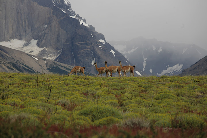 Guanacos grazing in the meadow.